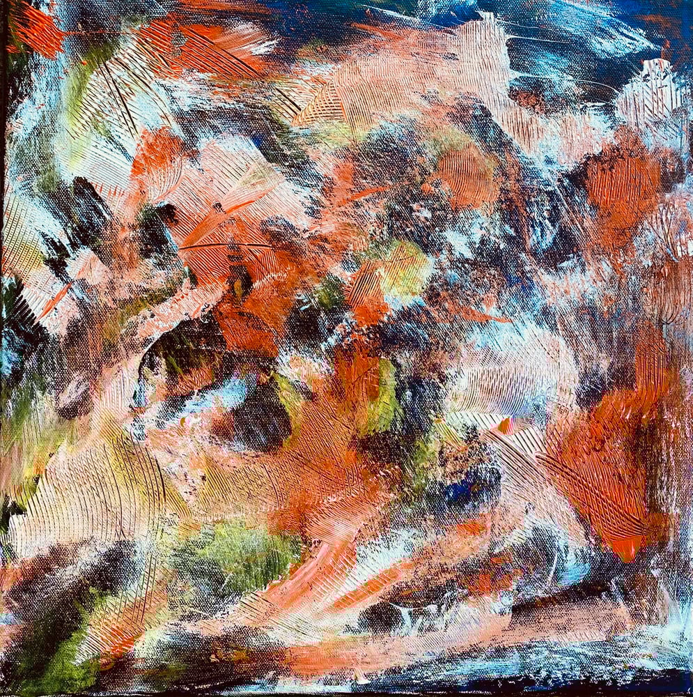 We start with a black canvas for this one so I can take the kitchen roll to smear drops of Burnt Orange, Yellow and Titanium White around the canvas to make a frenzied and colourful scene. The final act is adding striations with a comb.